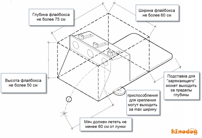 1.3.1. Организатор для проведения состязаний по флайболу должен обеспечить два нормативных устройства для выброса мяча - флайбокса. При желании, любая команда может выступать на своем флайбоксе.