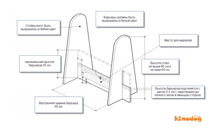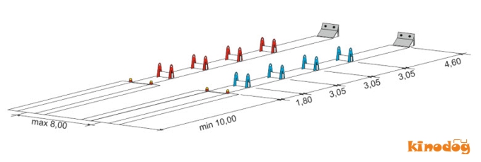 четыре одинаковых барьера. Их высота между 20 и 40 см (в зависимости от роста собаки). Расстояние между барьерами 3 метра, от линии старта до первого барьера 1,8 метра, от последнего барьера до катапульты 4,5 метра;