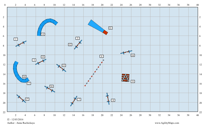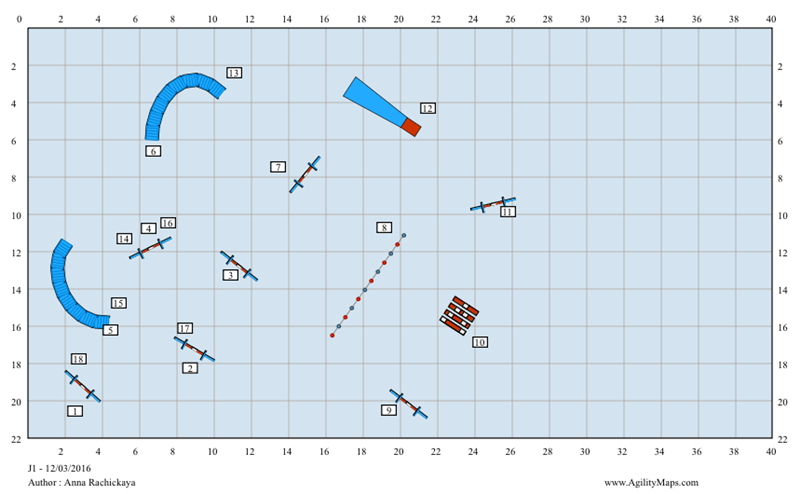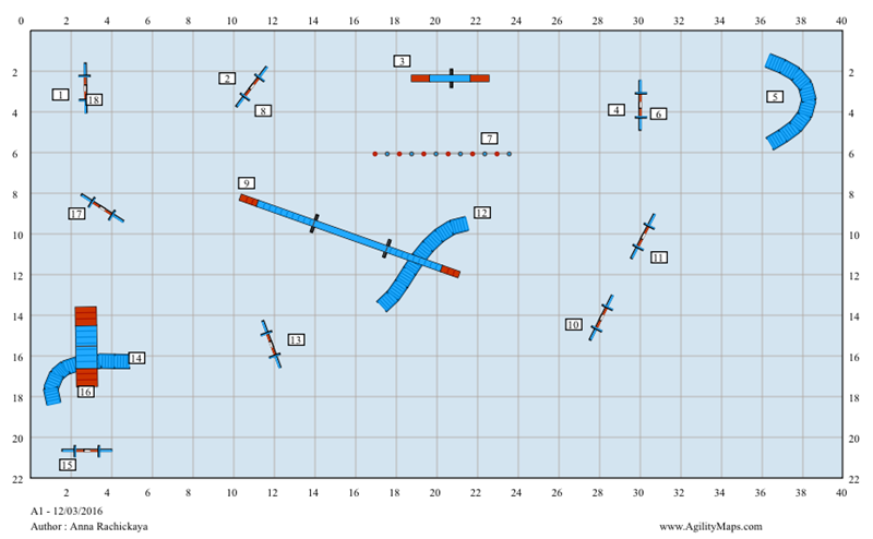 Здорово, что картинки есть! Аня -- молодец, хорошие трассы подготовила и ловко все организовала! Мне только кажется, что для А1 преодолевать бум, как здесь, когда поперек него туннель лежит -- это очень сложно. Хендлеру приходится уходить в сторону, а ведь следующий барьер по прямой .Здесь тяжело задать собаке верное направление, особенно, если она быстрая. Я бы такую связку уровнем А3 оценила.